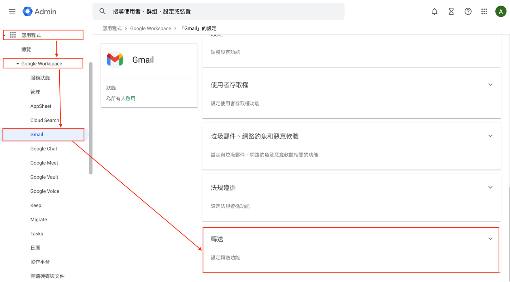 1.登入 Admin 後台 > 應用程式 > Google Workspace > Gmail > 轉送。