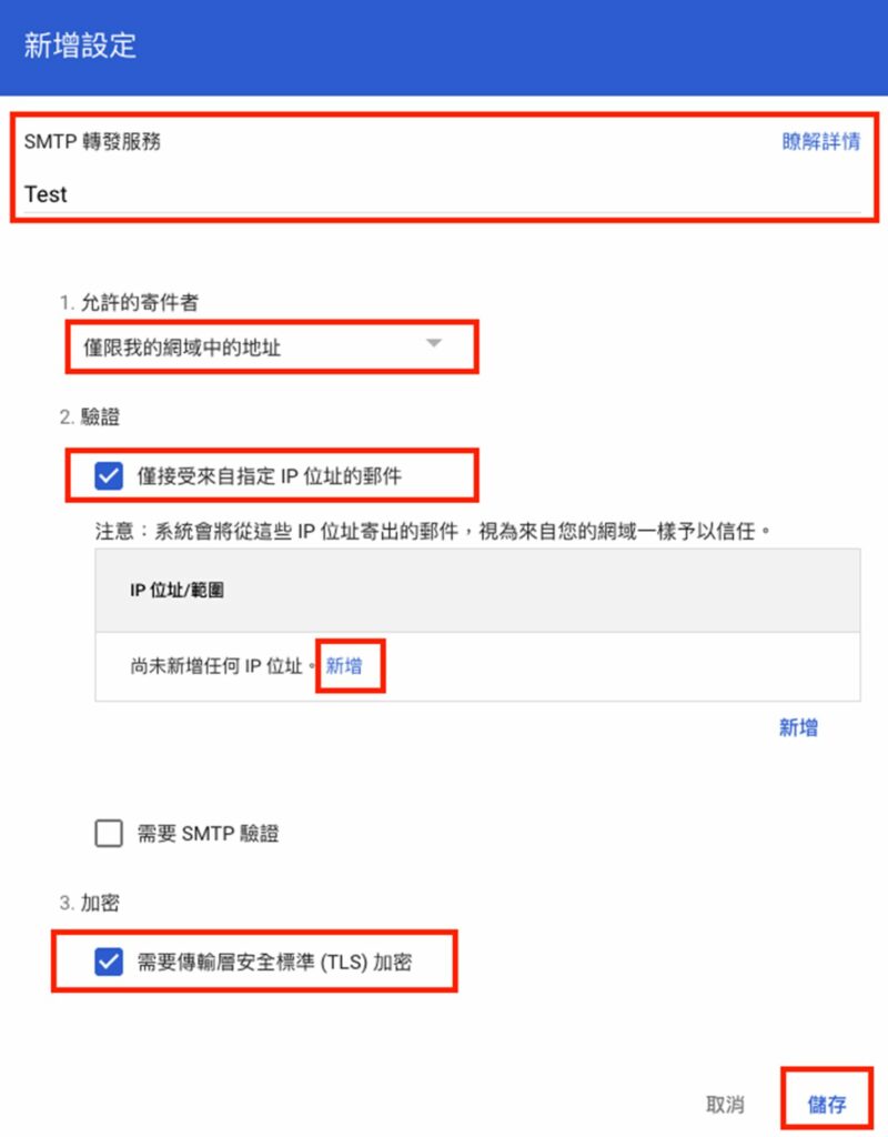 - 驗證:選擇「僅接受來自指定 IP 位址的郵件」> 新增企業內部系統的IP位址(表示Google會接受來自這些IP位址的郵件)。