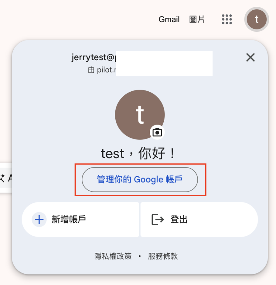 - 登入您要使用的 Gmail 後,請點右上角頭像,再選下方的「管理你的Google帳戶」。