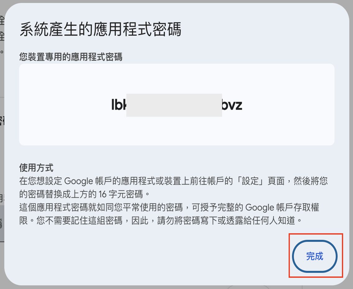 - 將系統產生的應用程式密碼複製記住(密碼務必要保存好,此畫面關閉後,無法再次取得密碼,只能刪除重新來)。