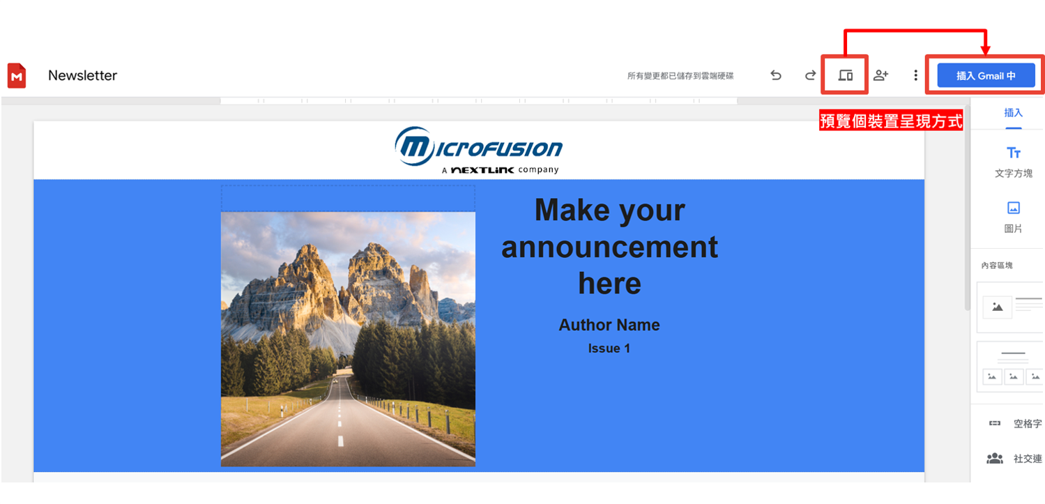在點擊「插入」到 Gmail 前,記得使用「預覽」圖示。你可以切換行動裝置、平板電腦與電腦模式,確保無論客戶是用手機還是在辦公室看信,排版都能完美契合。